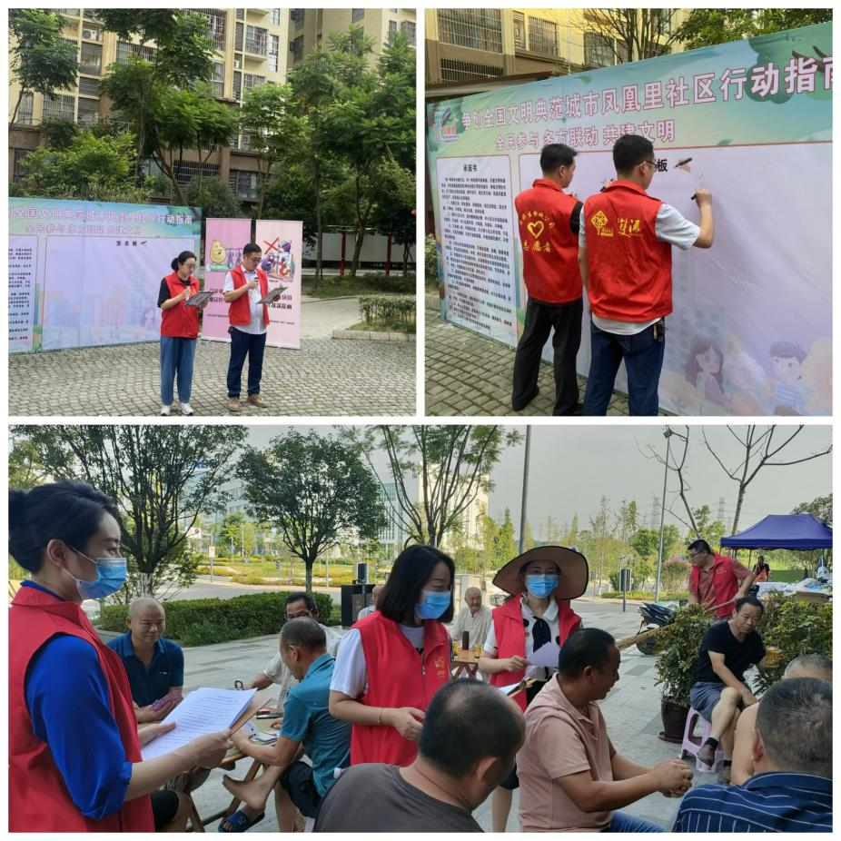 “爭(zhēng)創(chuàng)全國(guó)文明典范城市、爭(zhēng)做文明好市民,為了我們共同的家園,攜手同行,我們?cè)谛袆?dòng)!”活動(dòng)動(dòng)員儀式上,鳳凰里社區(qū)黨員代表與運(yùn)營(yíng)公司黨支部黨員代表共同宣讀了創(chuàng)建文明典范城市承諾書(shū),在社區(qū)群眾的見(jiàn)證下,全體志愿者在簽名墻上共同簽名承諾,承諾將以實(shí)際行動(dòng)參與到全國(guó)文明典范城市創(chuàng)建的行動(dòng)中去。儀式后,黨員志愿者組成宣講小分隊(duì)在小區(qū)周邊積極向群眾進(jìn)行文明典范城市創(chuàng)建宣貫宣講,通過(guò)最簡(jiǎn)單的描述引導(dǎo)小區(qū)居民深刻理解創(chuàng)建全國(guó)文明典范城市是建設(shè)踐行新發(fā)展理念的公園城市示范區(qū)的應(yīng)有之義,準(zhǔn)確把握創(chuàng)建工作在展示城市形象魅力、發(fā)展活力、治理能力上的重大意義,營(yíng)造人人爭(zhēng)當(dāng)文明城市創(chuàng)建者的社會(huì)氛圍。