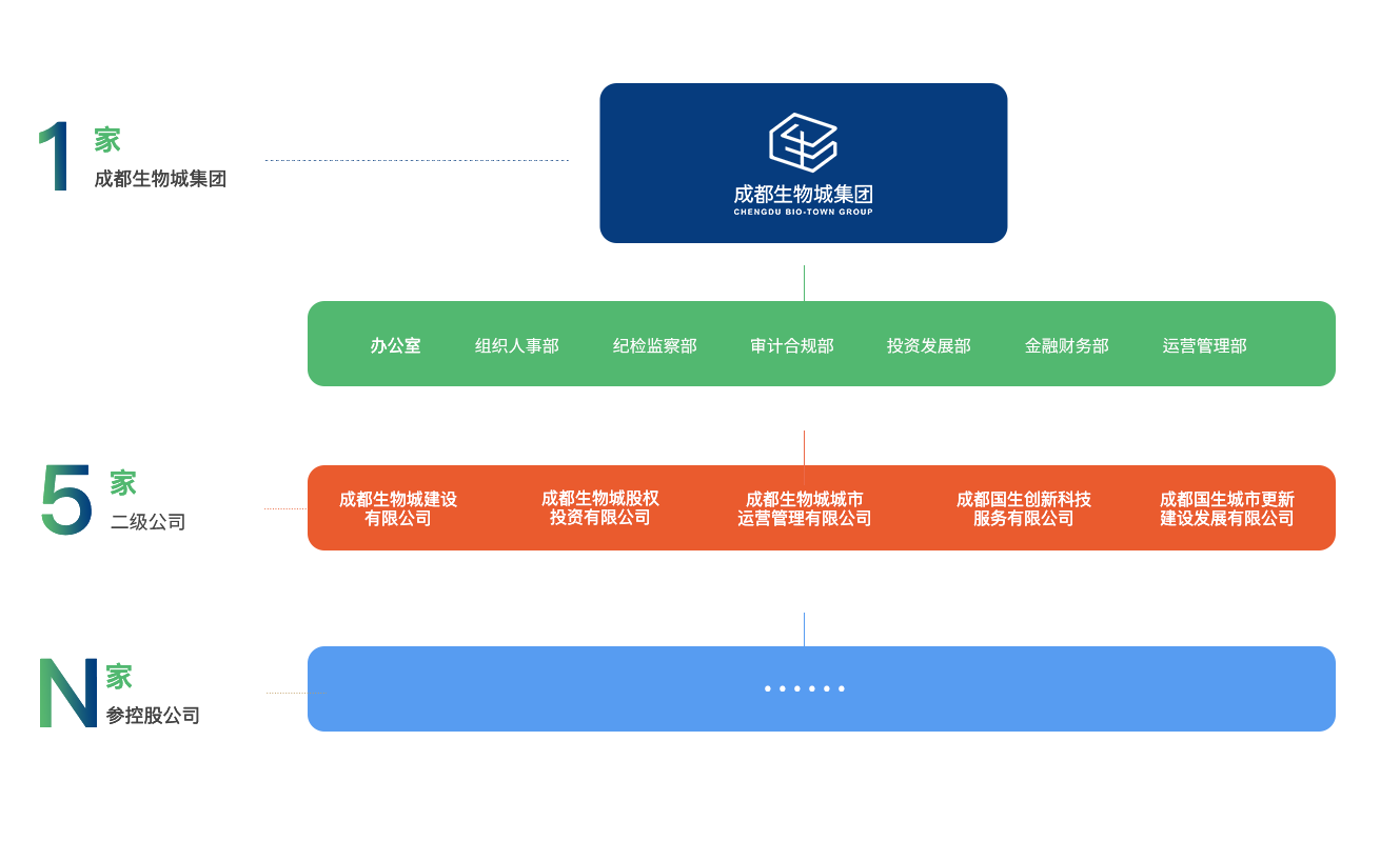 目前,集團(tuán)按照“1+5+N”三級(jí)架構(gòu)下設(shè)5個(gè)二級(jí)子公司,成都生物城建設(shè)有限公司、成都生物城股權(quán)投資有限公司、成都生物城城市運(yùn)營(yíng)管理有限公司、成都國(guó)生創(chuàng)新科技服務(wù)有限公司、成都國(guó)生城市更新建設(shè)發(fā)展有限公司。在三級(jí)公司積極推進(jìn)國(guó)企混改,引入社會(huì)優(yōu)質(zhì)戰(zhàn)略投資者,與中石油、格力、國(guó)藥、華西等行業(yè)龍頭成立合資企業(yè)10家,參股成都威斯克生物醫(yī)藥有限公司、成都海楓生物科技有限公司、成都天府國(guó)際生物城供應(yīng)鏈服務(wù)有限公司等企業(yè)。集團(tuán)資產(chǎn)規(guī)模超300億元,已獲得AAA主體信用評(píng)級(jí),通過(guò)ISO9001質(zhì)量管理體系認(rèn)證、ISO14001環(huán)境管理體系認(rèn)證、OHSAS18001健康安全管理體系認(rèn)證,并獲得ISO37301:2021及GB/T35770-2022合規(guī)管理體系雙認(rèn)證。